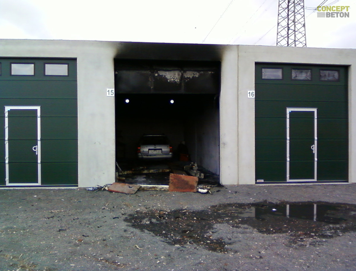 Diese Bild zeigt eine Garage, in der ein PKW komplett ausgebrannt ist. Der Wagen geriet bei Reparaturarbeiten in Brand, die Feuerwehr hatte nach Ihrem Eintreffen alles schnell unter Kontrolle. Das Feuer war aufgrund der massiven Bauweise nicht auf die angrenzenden Garagen übergesprungen. Nach der Überprüfung des Schadens durch einen Gutachter musste die Garage lediglich ein neues Tor erhalten und das Dach mit einer Schweißbahn abgedichtet werden. Sämtliche Betonteile waren unbeschädigt, nur die Innenwände wurden vom Ruß befreit. Glück im Unglück, für den Mieter und Eigentümer.